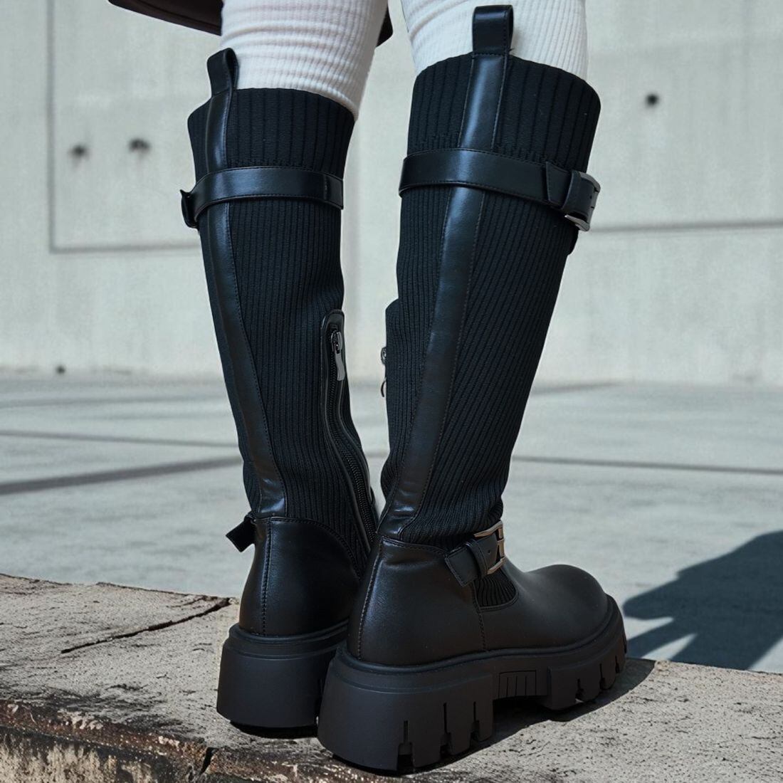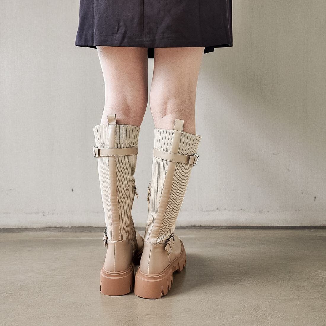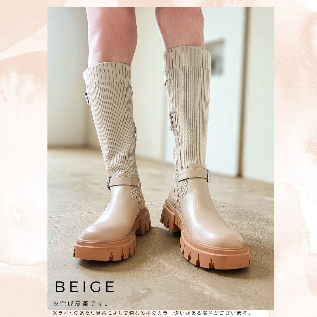 しなやかな合皮と、柔らかなニット素材を組み合わせたロングブーツ。
